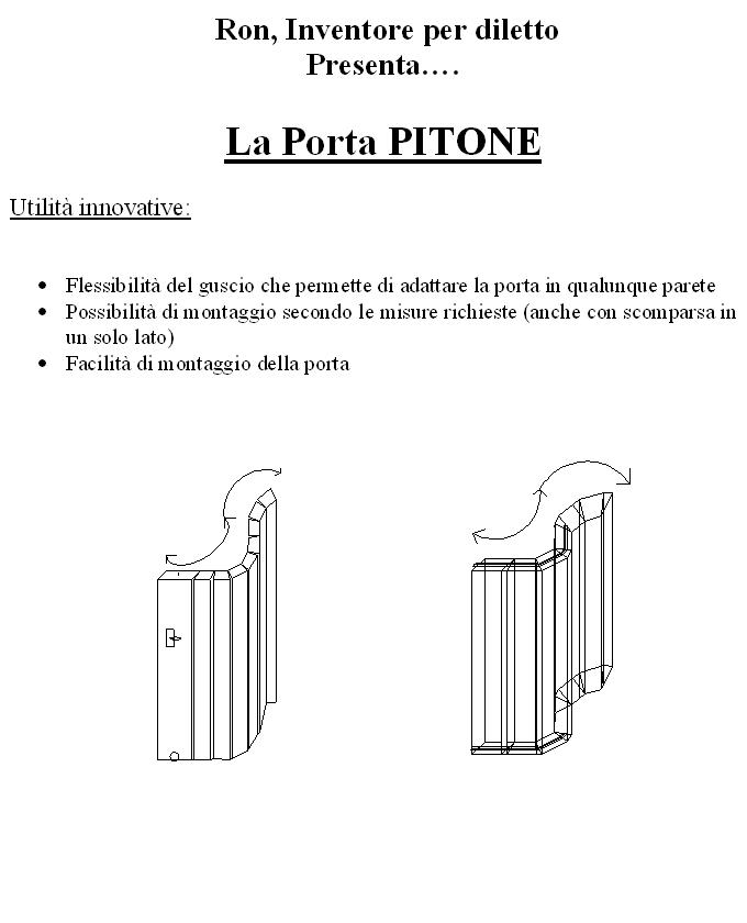 La porta jolly (PITONE) è l’innovativa invenzione che permette di montare in ambienti particolari quali stanze a pareti curve, paraboliche o addirittura a serpentina una robusta ed elegante porta scorrevole a scomparsa, con la possibilità di richiedere, da parte dell’utente, le misure (di estensione) più idonee al tipo di parete di cui si dispone.
